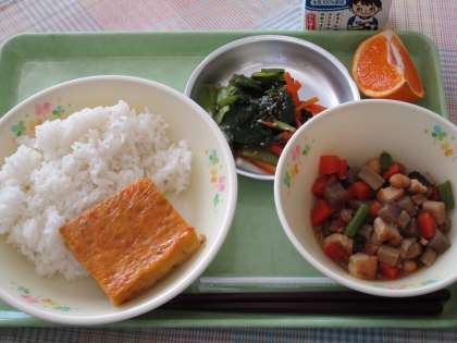 今日の給食は、主食、主菜、副菜、くだもの、乳製品の揃った「五つの輪で体力アップ献立」でした。バランスよく整えられています。残さずしっかり食べて体力アップしましょう。
