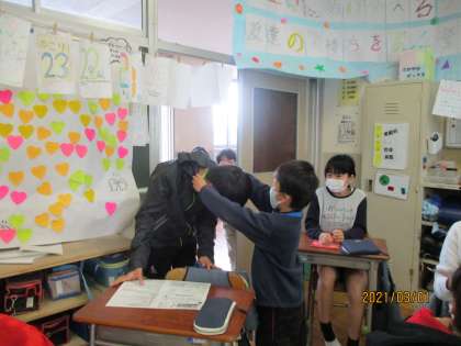 5じかん目には、 6年生にメダルを とどけに いきました。
