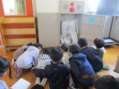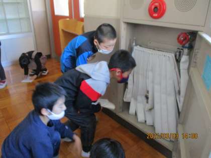 社会の「火事からまちを守る」の学習では、学校の消防設備を調べています。廊下にある消火栓や消火器を見学しました。「ホースは何メートルくらいまでのびるのかな。」「消火器のところにはマスクもいっしょにあるよ。」など、いろいろな発見をしていました。来週は、学校の消防設備をグループで調べます。どこにどんなものがあるのか、みんなで協力して調べたいですね。
