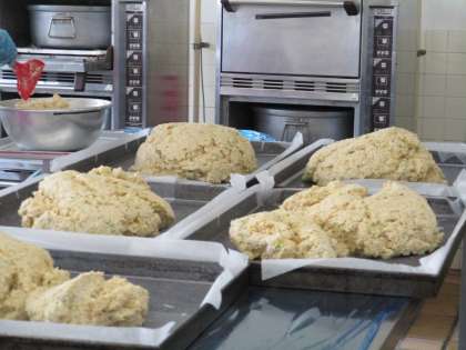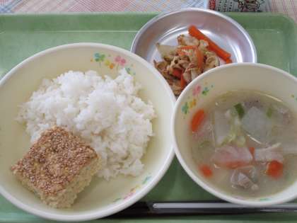 今日の松風焼きは豆腐がたっぷり入っていました。写真2枚目は、松風焼きの材料をすべて混ぜ合わせたものを鉄板に伸す前です。3枚目は松風焼きの焼き上がりです。