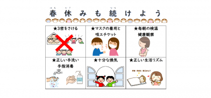 3月23日(火) 保健室から「春休みも続けましょう」 公開日 2021/03/23 更新日 2021/03/23 専科 もうすぐ春休みです。緊急事態宣言が解除され、春の日差しを感じる日も多くなりました。でも東京では毎日200人近い人が新型コロナウイルスに感染しています。 春休みも気を緩めることなく一人一人ができる感染対策を行っていきましょう。 いいね(0)