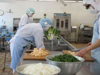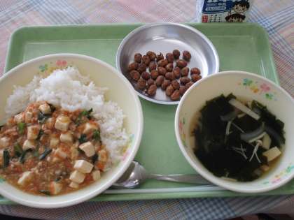 今日のマーボー丼には、「にら」や「ねぎ」がたくさん入っています。これらの野菜ははにおいが強いのが特徴ですが、においの元はスタミナになります。病気に対する抵抗力も強くなるので、病気の予防にも役立ちます。しっかり食べましょう。