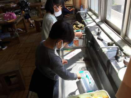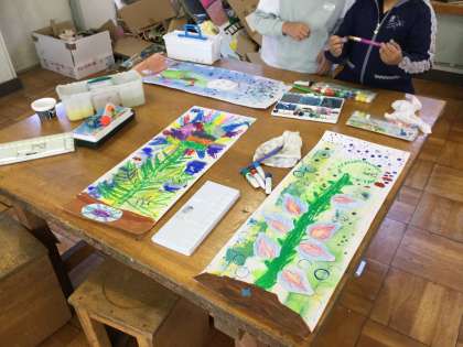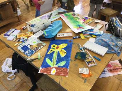 最後の画像は絵の具を洗っているところです。図工の時間の学びはこんなところにもたくさん潜んでいます。洗っている最中に混ざり合う絵の具の色に歓声を上げて、「先生、すごい!見て!絵の具が戦ってるよ!」という声に一緒に混ざり合う絵の具を見物して、私も学ばせてもらっています。