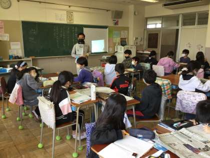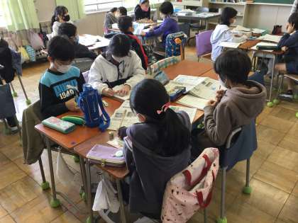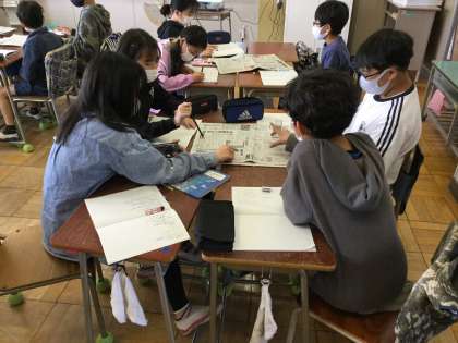 「新聞を読もう」の学習です。実際に新聞を広げ、新聞の特徴をみんなで話し合いました。「この太い線は何を表しているのかな?」「文章がどこにつながっているか、確かめてみて。」先生の問いに、子供たちは素早く反応し、真剣に考えていました。