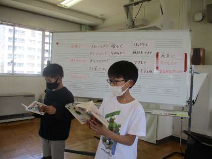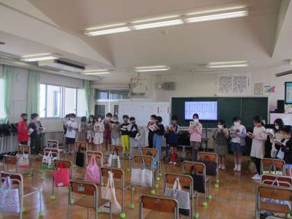 4年生では、当番の子どもの歌いたい歌を、めあてを決めて歌い、当番がめあてに向かって一生懸命歌っている子を前に連れてきて、そのすてきなところを発表するとういう活動をしています。