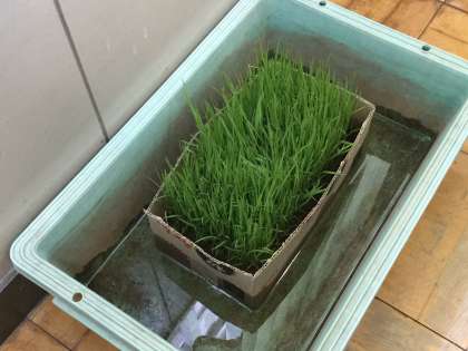 バケツ稲の取組が始まりました。教室で芽出しをしています。教室の傍らには苗が…。これから半年かけておいしい「上柚木米」づくりに励んでいきます。おいしいコメを作るために、どんな工夫や努力が必要か学び、実践していきます。