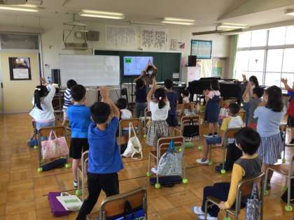 授業の終わりにちょっとお楽しみの「3時のおやつ」で、リズムに乗って音楽ゲームをしているところです。