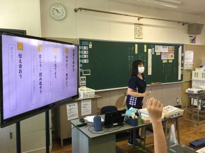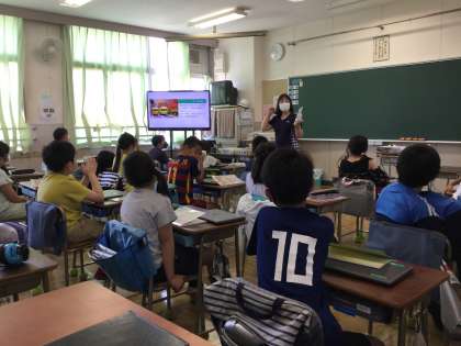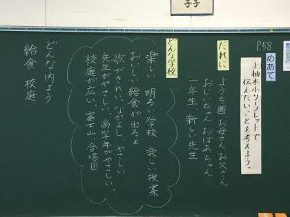 リーフレットをつくって、自分の伝えたいことを表現します。リーフレットの題材は「私たちの上柚木小学校」。4年生が考えた「上柚木小学校」はどんな学校か出し合いました。「たのしい、あかるい、給食おいしい、先生がやさしい、高学年がやさしい、なかよい、楽しい授業」などなど。これから自分たちでどんな内容を書くか考え、上柚木小学校のよさを伝えるためのリーフレットをつくっていきます。でき上ったらホームページでお伝えします。どんなリーフレができ上るかとても楽しみです。
