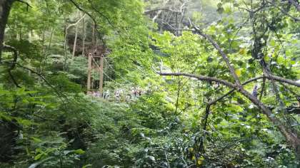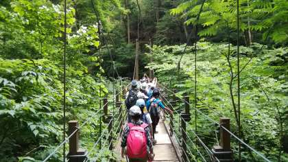 つり橋を渡ります。歩くと橋が揺れます。ちょっと怖いです。