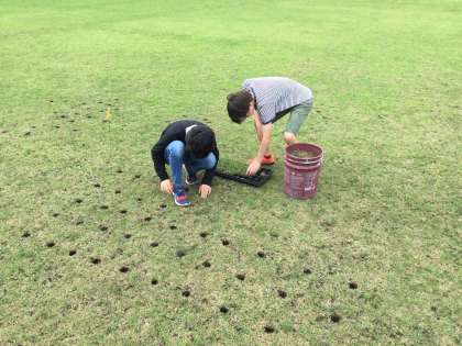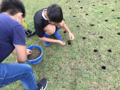 本校の学校運営協議会の委員である上柚木競技場の杉下さんの計らいにより、6年生が上柚木競技場の芝生を植えました