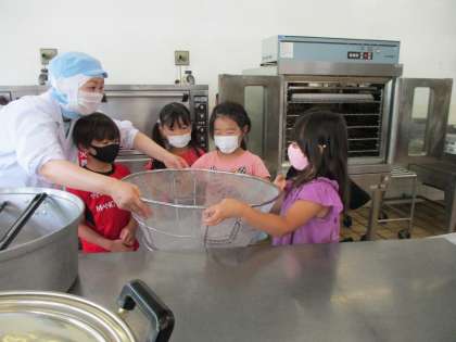 事前に、給食を作るためにある、色々な機械の役割や仕組みなどを説明してもらいました。