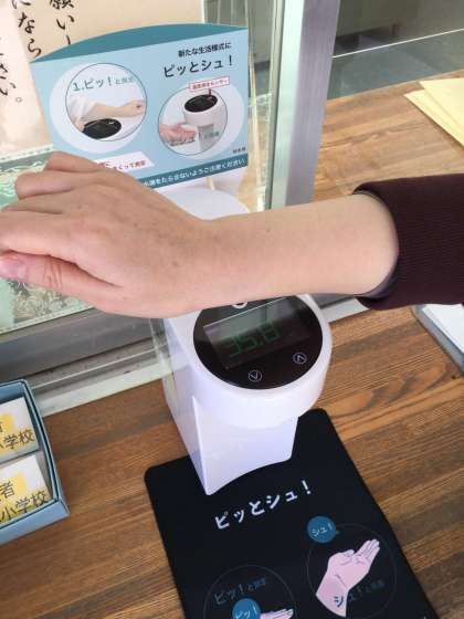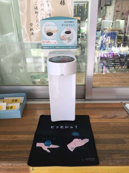 事務室前に新しく自動手指消毒器が設置されました。下からアルコールがでます。上に手をかざすと体温が測れます。来校の際は、事務室にお声掛けの上、こちらの消毒器をご使用ください。
