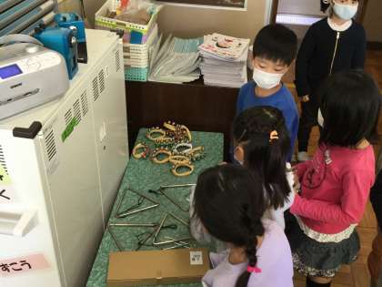 みんなで合奏です。これから使う楽器は、すず、トライアングル、鉄琴、木琴などです。班ごとに楽器を決めて合奏に臨みます。みんなで合わせることを楽しめるようにしましょうね。