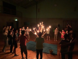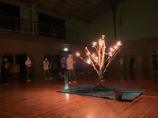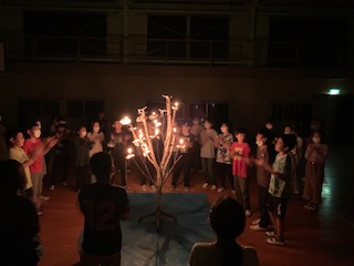 キャンドルファイヤーの最後は、みんなでキャンドルを囲んだ『友よ』を歌いました。雨でキャンプファイヤーはできませんでしたが、キャンドルファイヤーを全力で楽しみました。