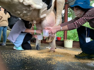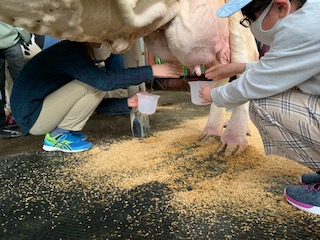 9月8日 姫木平移動教室20 公開日 2022/09/08 更新日 2022/09/08 ゆうゆう記 いよいよ乳搾り体験です。利き手の人差し指と親指で輪を作って「乳首」の根本を“ぎゅっ”と握ります。中指、薬指、小指と順に握って搾ります。子供たちおっかなびっくりでしたが少しずつ慣れてきました。搾りたての牛乳は意外と熱いと言っていました。 いいね(0)