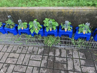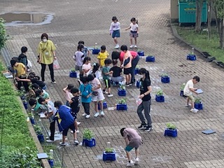 1年生がアサガオを育てています。小さな双葉だけだった鉢も本葉が大きく育ってきました。