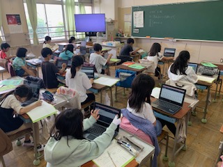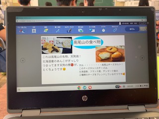 4年生は、総合的な学習の時間で『高尾山について』調べています。クロムブックを使って、4つのスライドに分けてまとめていました。来週の遠足で現地、高尾山に行って自分の目で確かめられること楽しみにしていました。(天狗焼きやチーズタルトは確かめられないかな?休日にお家の方と確かめてくださいね)