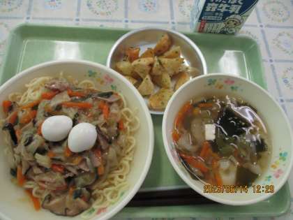 ◆今日の給食◆ ・あんかけやきそば ・揚げじゃが ・わかめスープ ・牛乳