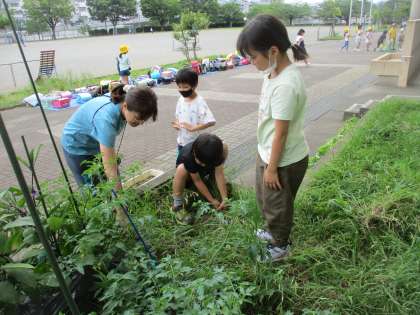 畑ボランティアの子供たちが、雑草を抜いた後、収穫、水やりを行いました。