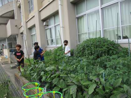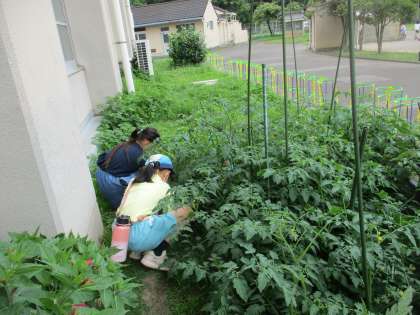 今、畑にはたくさんの野菜の花が咲いています。これからどんどんたくさんの実ができることでしょう。自分のミニトマトだけでなく、畑のお世話もがんばっていきましょう。