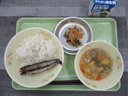 ◆今日の給食◆ ・麦ごはん ・ししゃもの七味焼き ・じゃが芋のそぼろ煮 ・ごまあえに ・牛乳