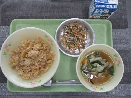 たまご入りチャーハンは、卵、にんじん、たまねぎ、鶏肉が入っています。