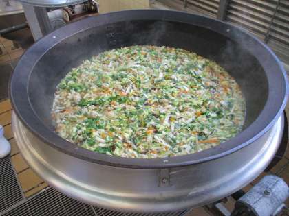 スープは、ねぎ、はくさい、にんじん、たまねぎ、しいたけ、チンゲン菜、きくらげ、そして肉団子と具だくさんで豪華になりました。給食室でも「今日のスープは豪華だね。」と話していたところです。2枚目の写真は、スープを作っている写真です。具沢山なので、釜がいっぱいになりました。