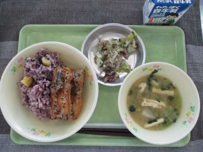 ◆今日の給食◆ ・秋月ごはん ・石垣揚げ ・ゆかり和え ・八王汁 ・牛乳