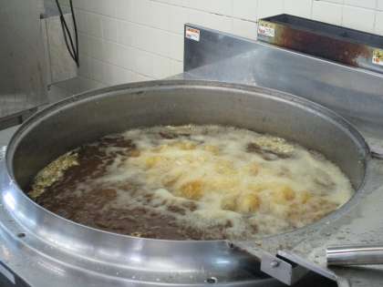 写真は、ますを揚げている様子です。