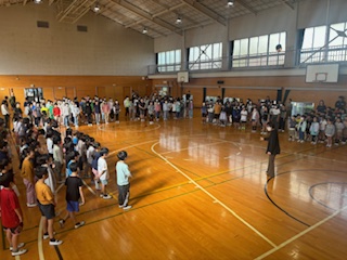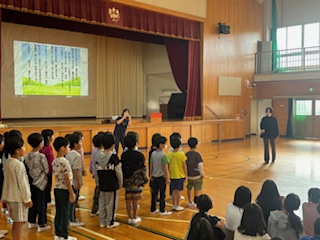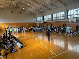 9月10月の歌『ゆかいに歩けば』を全校で歌いました。456年生は2部合唱です。低学年は高学年のきれいな歌唱に自然と拍手していました。