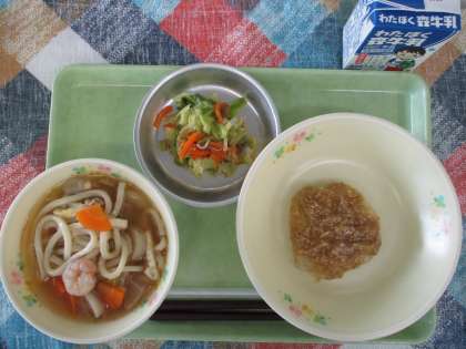 ◆今日の献立◆ ・ちゃんこうどん ・じゃがもちのごまみそだれ ・梅しらす和え ・牛乳