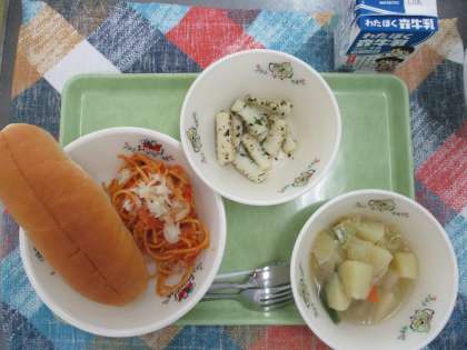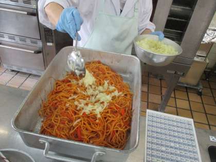 今日の給食では、刻み玉ねぎを軽く茹でで、ナポリタンの上に乗せました。