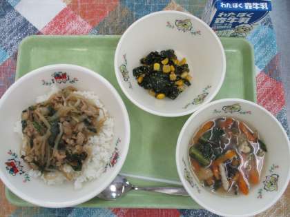 ◆今日の献立◆ ・スタミナ丼 ・中華スープ ・わかめのしょうが炒め ・牛乳