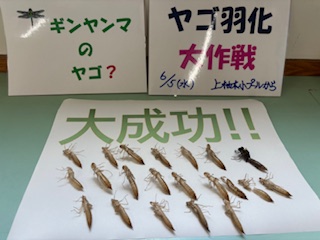 今年のプール清掃の時に、たくさんのギンヤンマのヤゴを救出することができました。残念ながら1匹だけ羽化に失敗してしまいましたが、20匹の羽化に成功し、空に放つことができました。普通に飛んでいるギンヤンマはスピードが早く人の近くに止まってくれないので、捕まえるのが困難です。子供たちに羽化したギンヤンマを間近に見せて、空に放ってあげる経験がたくさんできました。上柚木小育ちのギンヤンマたち、来年もよろしく。