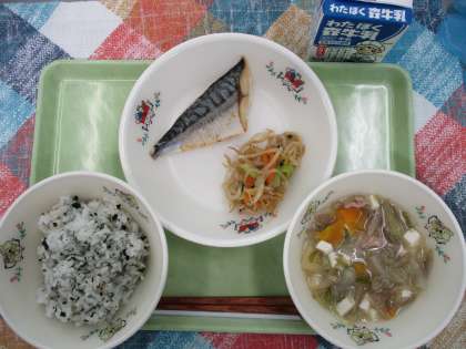 ◆今日の献立◆ ・わかめごはん ・さばの塩焼き ・もやしのからあえ ・豚汁 ・牛乳