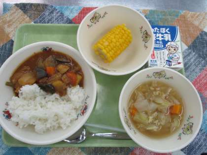 7月10日(水)今日の給食 公開日 2024/07/10 更新日 2024/07/10 給食 ◆今日の献立◆ ・夏野菜のカレーライス ・ABCスープ ・ゆでとうもろこし ・牛乳 とうもろこしは昨日3年生が皮むきをしてくれました。 水分が多く、とても甘いとうもろこしでした。 いいね(0)
