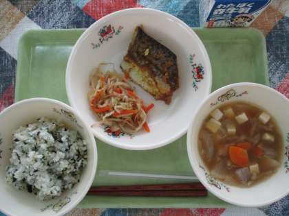 ◆今日の献立◆ ・わかめごはん ・さばのカレー焼き ・野菜のおかか和え ・けんちん汁 ・牛乳