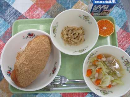 ◆今日の献立◆ ・きなこ揚げパン ・ポトフ ・だいこんとツナのサラダ ・みかん ・牛乳