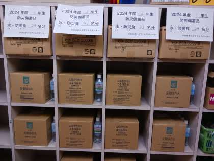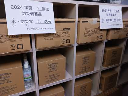 上柚木小学校は、生徒一人あたり500ミリリットルの水2本と防災食1食を備蓄しています。