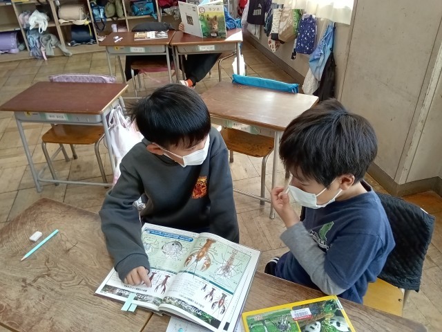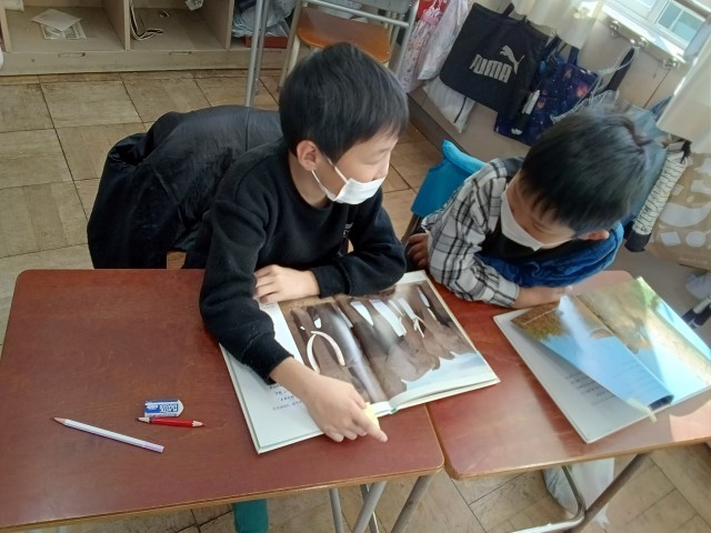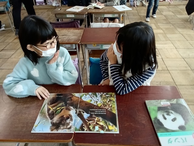 国語の時間に、自分がすごいと思った動物について、友達に紹介しました。話し手は、本を指さし、友達が理解したかを確かめながら伝えていました。聞き手は、友達の話にうなずきながら、身を乗り出して聞いていました。動物のすごさに、一緒に驚く姿がほほえましかったです。