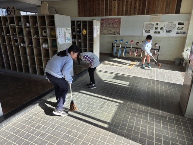 飼育、美化、栽培委員会の子供たちが、正門や昇降口、階段の清掃をすすんでしていました。校庭に落ちた枝も拾っていました。最近、風が強かったので、落ち葉や枝、砂ぼこりがありました。子供たちが考えて清掃することにしたそうです。みんなで使うところをきれいにしようとする姿がすばらしいです。