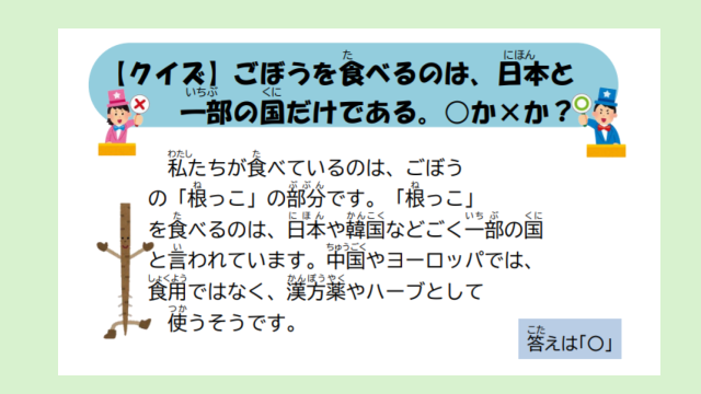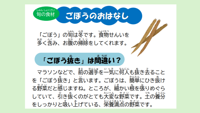 ごぼうは食物繊維が豊富で、おなかの調子を整えてくれますよ。