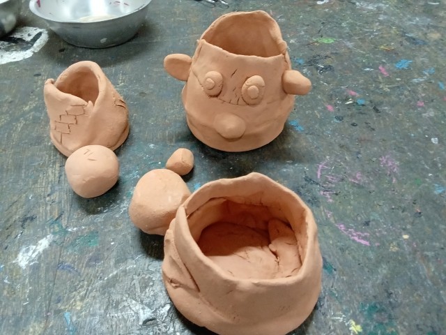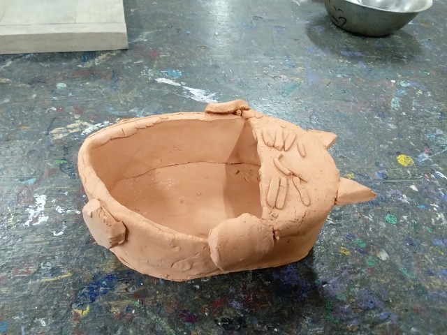 今回はろくろを使いました。片方の手でろくろを回しながら、もう一方の手で粘土の形を整えています。だんだんとこつを覚えて、思ったとおりの形に近づきました。前回、たたらを用いて作った作品が焼き上がりました。