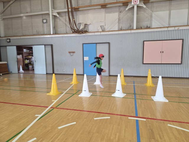 まず体ほぐしに、体でじゃんけんを楽しみました。それから、いろいろなものを跳ぶ遊びをしました。子供たちで跳ぶ場所の工夫しながら、跳び方を変えるなどしていました。