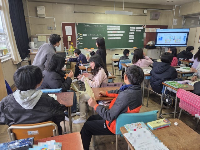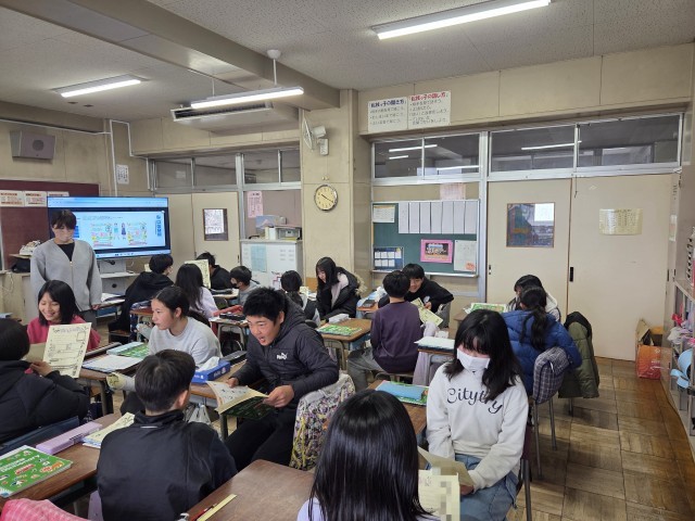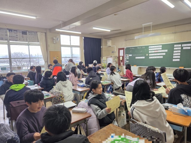 将来の夢は何ですか。得意なことは何ですか。好きな教科は何ですか。など今まで習った言葉を使って、英語で会話していました。中学校に行っても、英語を楽しんでほしいです。