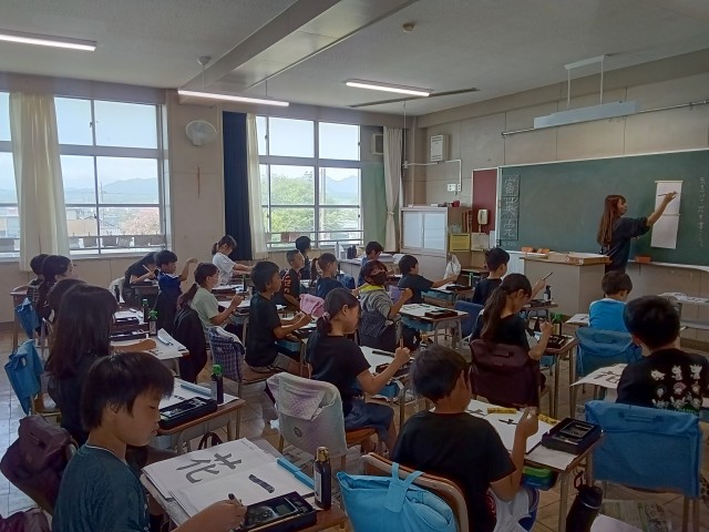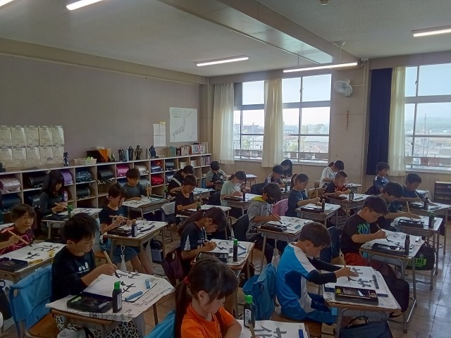 先生にとめ、はらいのこつを教わりながら、一画一画丁寧に書いていました。教室がシーンとなるほど、真剣に取り組んでいました。