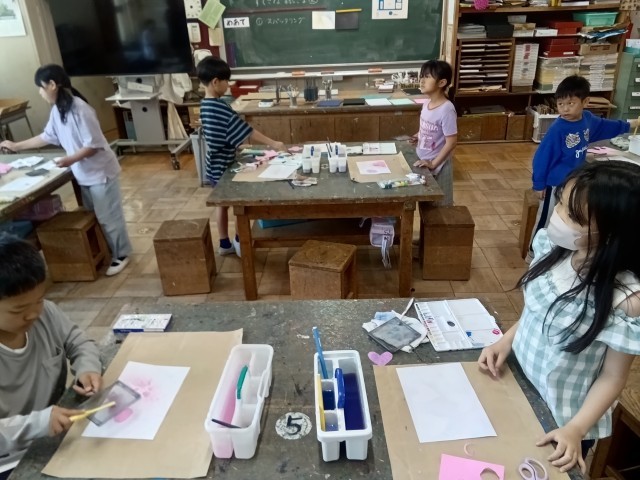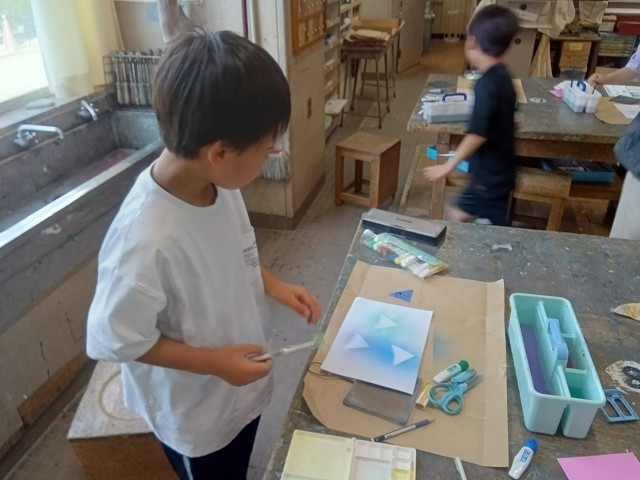 スパッタリングにチャレンジです。ハブラシと網を使って、絵の具を吹きかけていました。淡い優しいイメージの作品になりました。