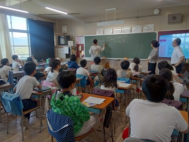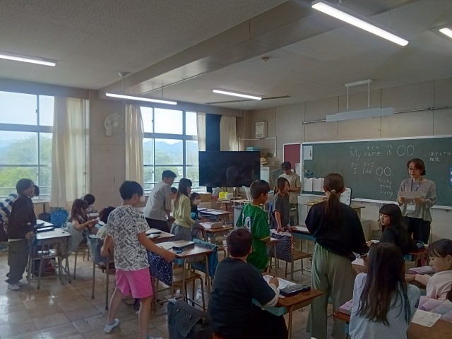 外国語の先生との授業が始まりました。今日は自己紹介をしました。担任の先生だけでなく、副校長先生も参加していました。楽しく外国語の学習に取り組んでいました。