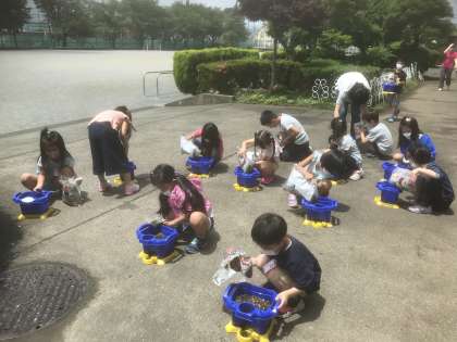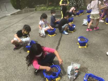 1年生の少人数指導後半の様子です。アサガオの種を頑張って植えています。