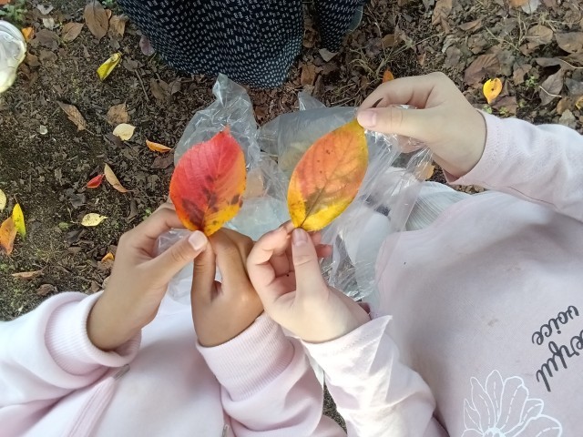 校庭で色付いた葉をたくさん見つけることができました。友だちと一緒に秋を味わってい...